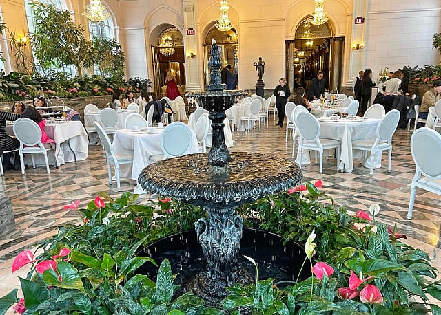 Inside, we are escorted to our table in the glorious Atrium by a lovely hostess. Clearly, there have been cancellations, due to the weather. First, a refreshing Mimosa made with sparkling wine and orange juice. It is always a joy for me to enter this circular room, and I don't really know why, perhaps it is a faint memory from decades past. The gorgeous sculpted ceiling, the flowers and greenery that encircle the room of white clothed tables, and to see the snow billowing over the landscaped grounds through Palladium windows makes us feel as if we are figures in a winter greeting card.