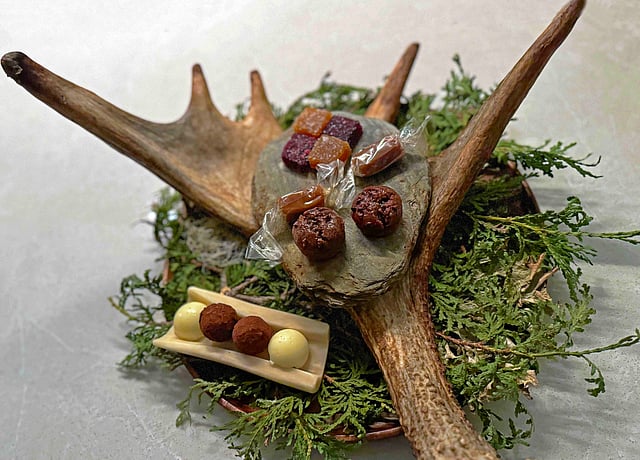 As each course is cleared we ask, "What could possibly come next?" Even dessert is a multi-course experience beginning with an extravaganza of chocolate ganache and sea buckthorn ice cream and ending with a moose antler cradling two types of pâte de fruit: one of haskap and juniper, the other of rose and quince. There are hazelnut financiers dipped in pineapple weed syrup, sea salted caramels, and two types of chocolate truffles: one burnt honey and spruce, and one smoked bone marrow fudge.