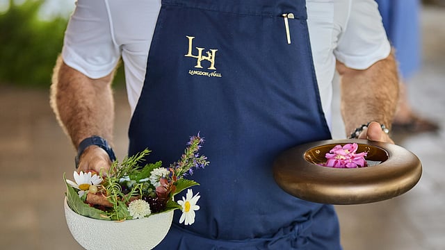 In the lounge before lunch, I am offered an amuse bouche nestled in a refreshing floral bouquet—smoked trout nasturtium, a quail egg sprouting tiny ferns and flowers, and a herbal elixir in a glass.