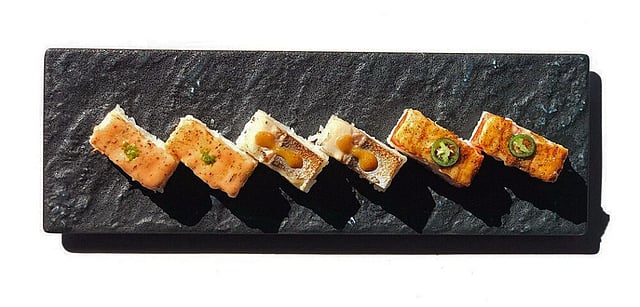 incorporated here: temarizushi (hand balls), ohizushi (pressed sushi), and aburi style (torched sushi). Temari are decorative embroidered balls given to girls on Hinamatsuri (Girl's Day) in Japan, and the corresponding sushi is made to look like them. Ohizushi comes from Kansai, and is most popular in Osaka. It involves pressing the sushi in wooden blocks. The fish is cooked—not raw—and is flattened against the rice. Aburi style of torching the fish releases oils that enhance the distinct flavour profile of each piece of sushi, and add to it a grilled essence. More importantly though, I am happy to notice that this is an Oceanwise menu. That means the seafood served here is in season and sustainably caught. The value of this in today's world of over-fishing cannot be overstated.