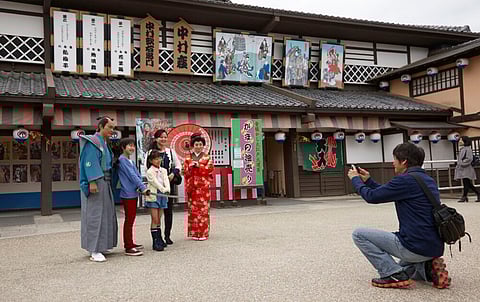 In the interests of research, I wanted to have my 15 minutes as a Geisha, so I traveled to Eigamura Studios in Ukyo-Ku outside of Kyoto, to get into costume. A portion of this studio is open to the public. The makeup department took about an hour to apply the white make up to my face, pink eye makeup and black eyeliner, and a three prong fork shaped area at the back of my neck. An ornate black wig covered my head, but, they let me know that my blue eyes simply looked "wrong." I stood with my arms outstretched as two women from the wardrobe department dressed me in the layers of silks, and showed me how to hide my hands in the folds of the sleeves in a certain way. Next came the white tabi socks and wooden clogs, like big wooden flip flops.